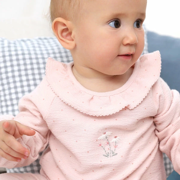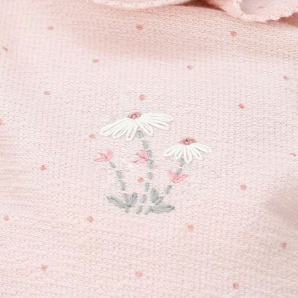 Made from the softest organic jersey with a delicate light pink dot design and hand-embroidered flower motif, this babygro is absolutely stunning.