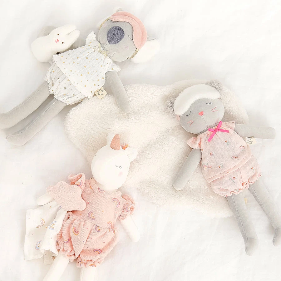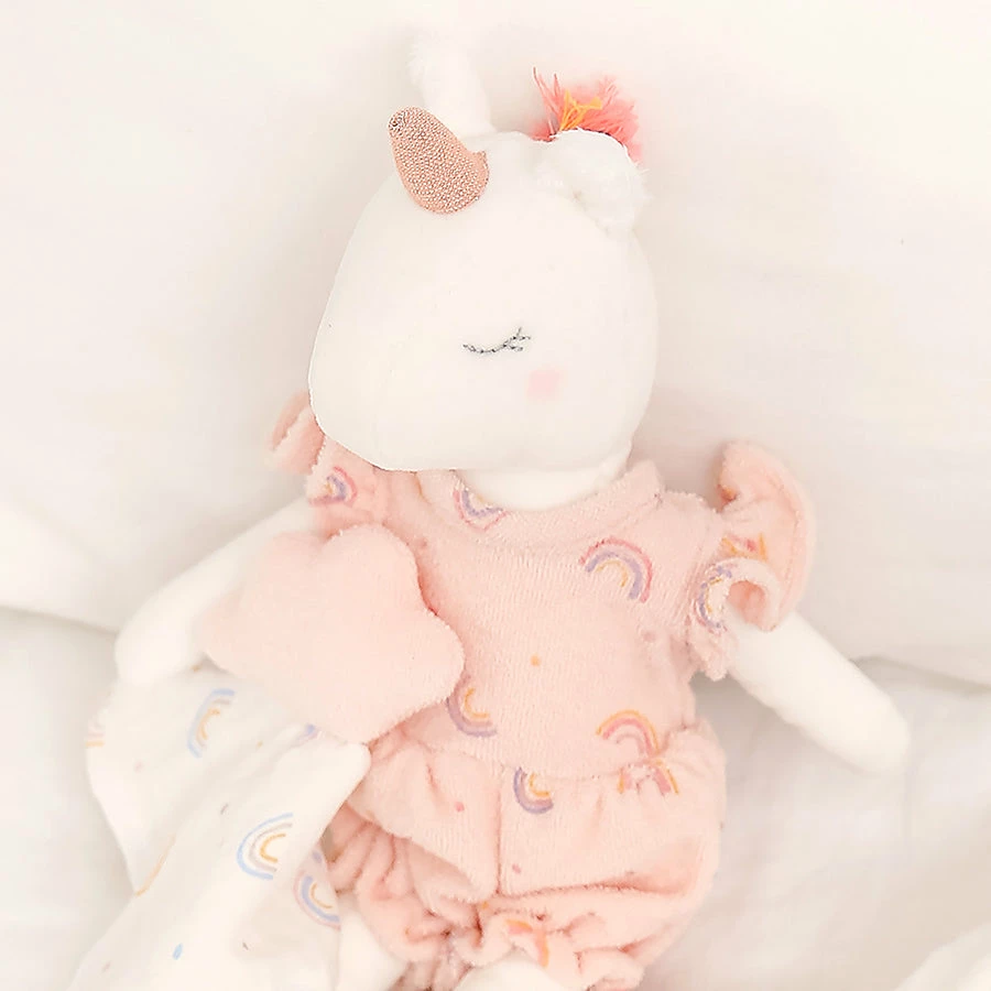 Peluche Unicorno con set notte Brand new to our Albetta sparkle collection, our delightful new cotton velvet rainbow unicorn set will provide hours of fun! Dressed in stunning sparkle print, baby pink nightwear to match our kids pyjamas, our magical velvet unicorn comes with a super soft cloud blanket using faux fur fabric made from recycled plastic bottles, a mini cloud comforter, and is complete with a gorgeous organza, foil print gift bag. The cute outfit is fully removable; dressing and undressing our cotton velvet unicorn is a fun way to teach children the important life-skill of how to dress themselves, all through imaginative play! 100% cotton velvet and filling 100% polyester fibre. UK/CE toy tested – 3 years plus recommended. Dettagli: fatto a mano da artigiani prodotto in Vietnam