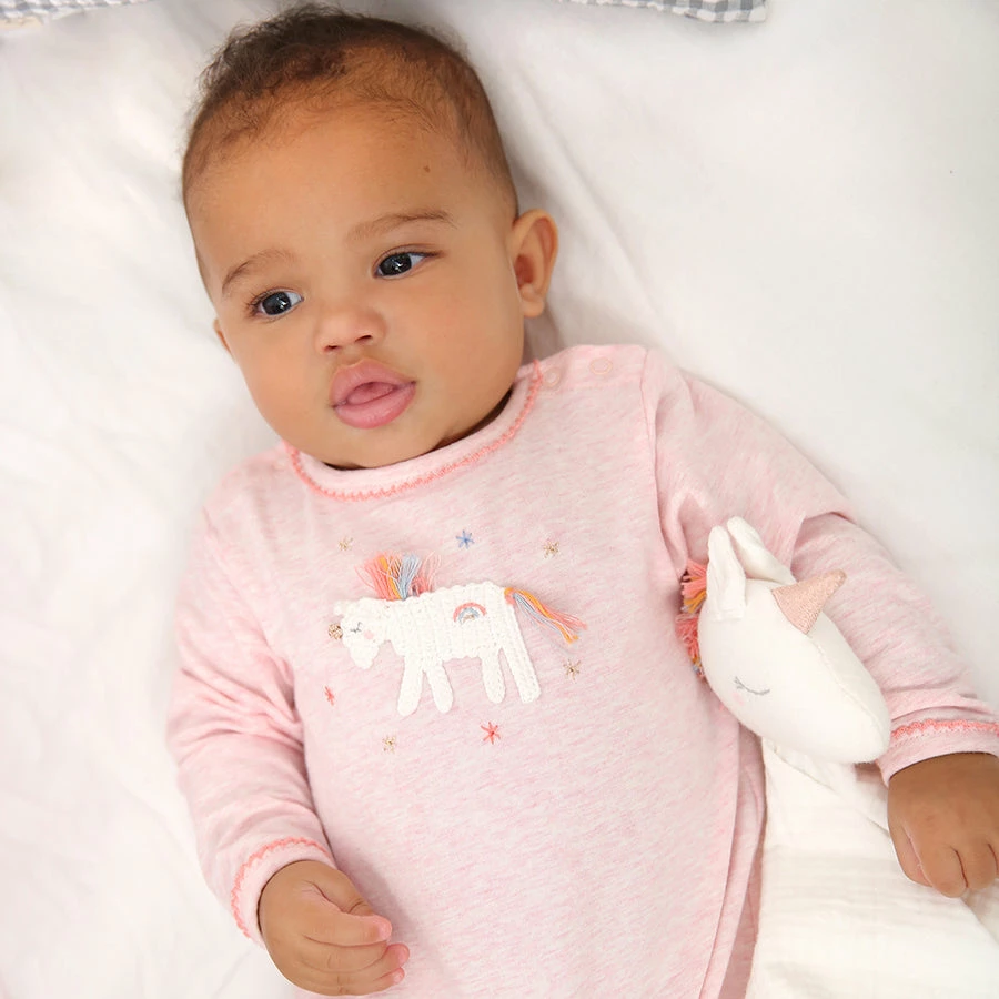 Tutina con dettaglio all’uncinetto – Unicorno La sua prima tutina, morbida e confortevole, senza piedini, si apre al cavallo e alle spalle con bottoni a pressione. Se lo si desidera può essere acquistata in coordinato con il sonaglio dello stesso soggetto. Dettagli: 100% cotone, da fonti di produzione sostenibili (BCI) prodotto in modo etico in Vietnam dettagli in maglia fatti a mano da artigiani testato OEKO-TEX per sostanze nocive bottoni automatici privi di nichel e piombo lavabile in lavatrice a 30° taglia 0-3, 3-6 e 6-12 mesi