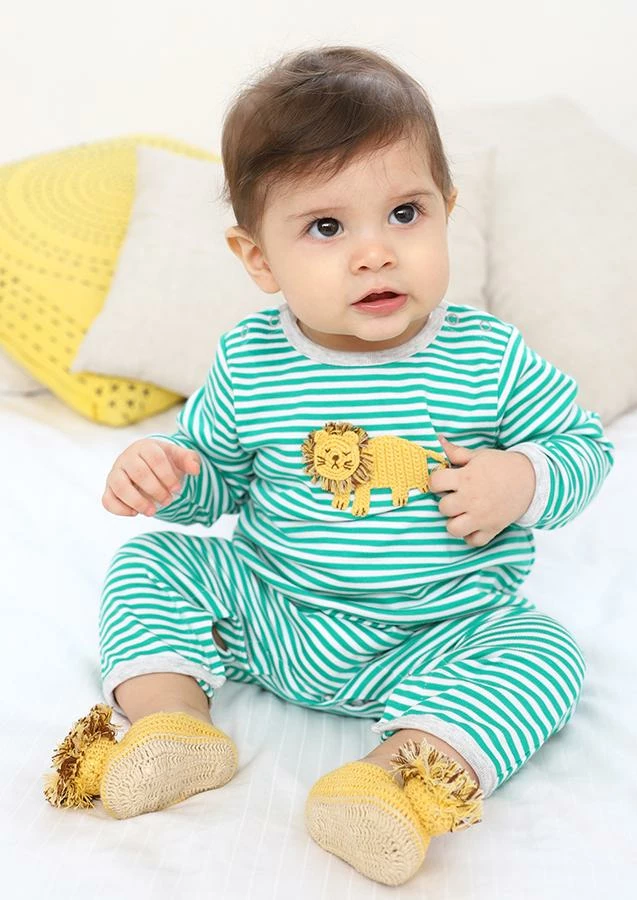 Tutina con dettaglio all’uncinetto – Leone Un meravigliosa tutina con un simpatico leoncino. La sua prima tutina, morbida e confortevole, senza piedini, si apre al cavallo e alle spalle con bottoni a pressione. Se lo si desidera può essere acquistata in coordinato con il sonaglio dello stesso soggetto. Dettagli: 100% cotone, da fonti di produzione sostenibili (BCI) prodotto in modo etico in Vietnam dettagli in maglia fatti a mano da artigiani testato OEKO-TEX per sostanze nocive bottoni automatici privi di nichel e piombo lavabile in lavatrice a 30° taglia 0-3 e 3-6 mesi