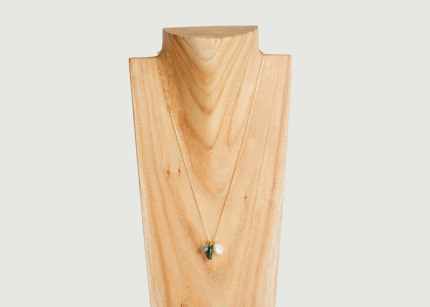 Thin brass necklace gilded with 24K gold, decorated with tiger eye, African blue opal and freshwater pearls. Adjustable length. Handmade in Paris. With a nod to Egyptian charms, the Ximena collection glows with semi-precious stones, river pearls and lucky beetles that spread their positive vibes. Adopt it to embellish your neck and make your outfit sparkle.
