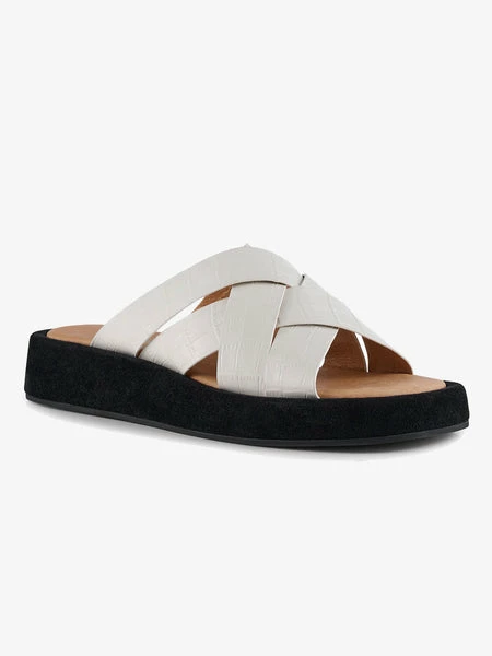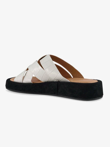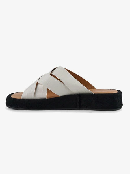 The Astrid Mule from Shoe the Bear shows off a cross design and a platform sole. Made in a off white soft leather with a croc pattern and finished with a suede sole, these sandals are both practical and elegant. Pair with your favourite dresses for a smart casual look.