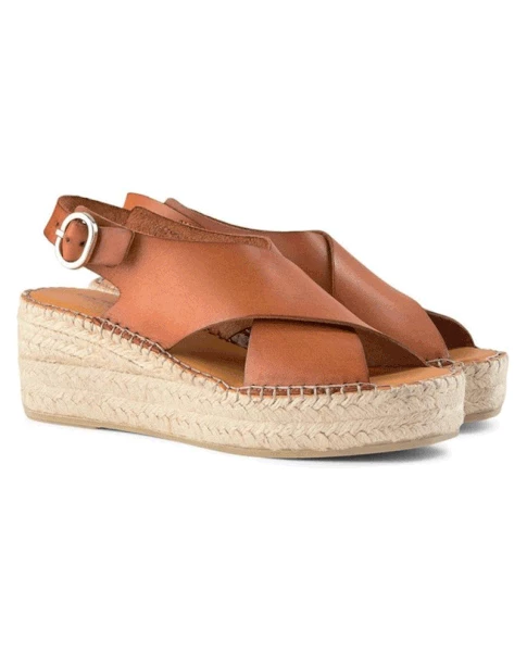 Shoe The Bear Orchid Tan Wedge Sandal, a tan brown pair of leather wedges with buckles on the heel and a cross over design. Deigned for comfort these casual espadrilles have natural braided heels and rubber soles. 100% Leather with microfibre padded insole Made in Spain Leather care recommended Fit true to size Heel height 6.6cm