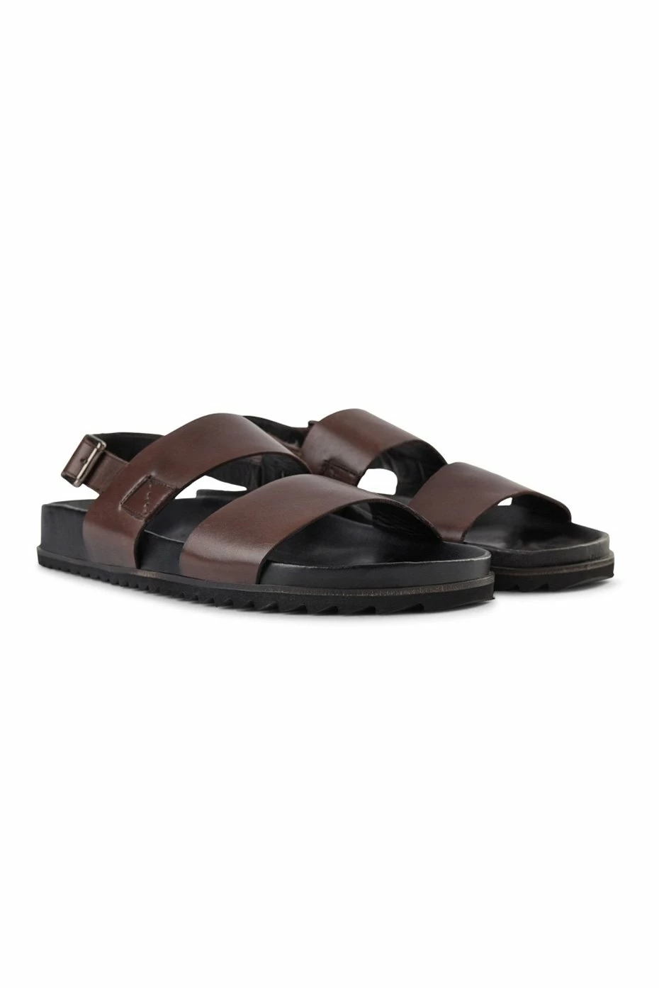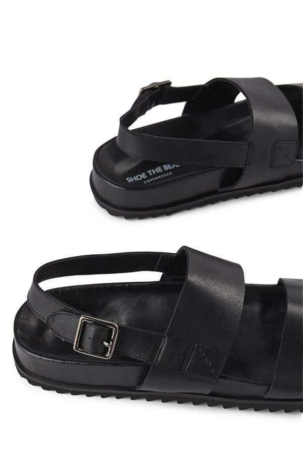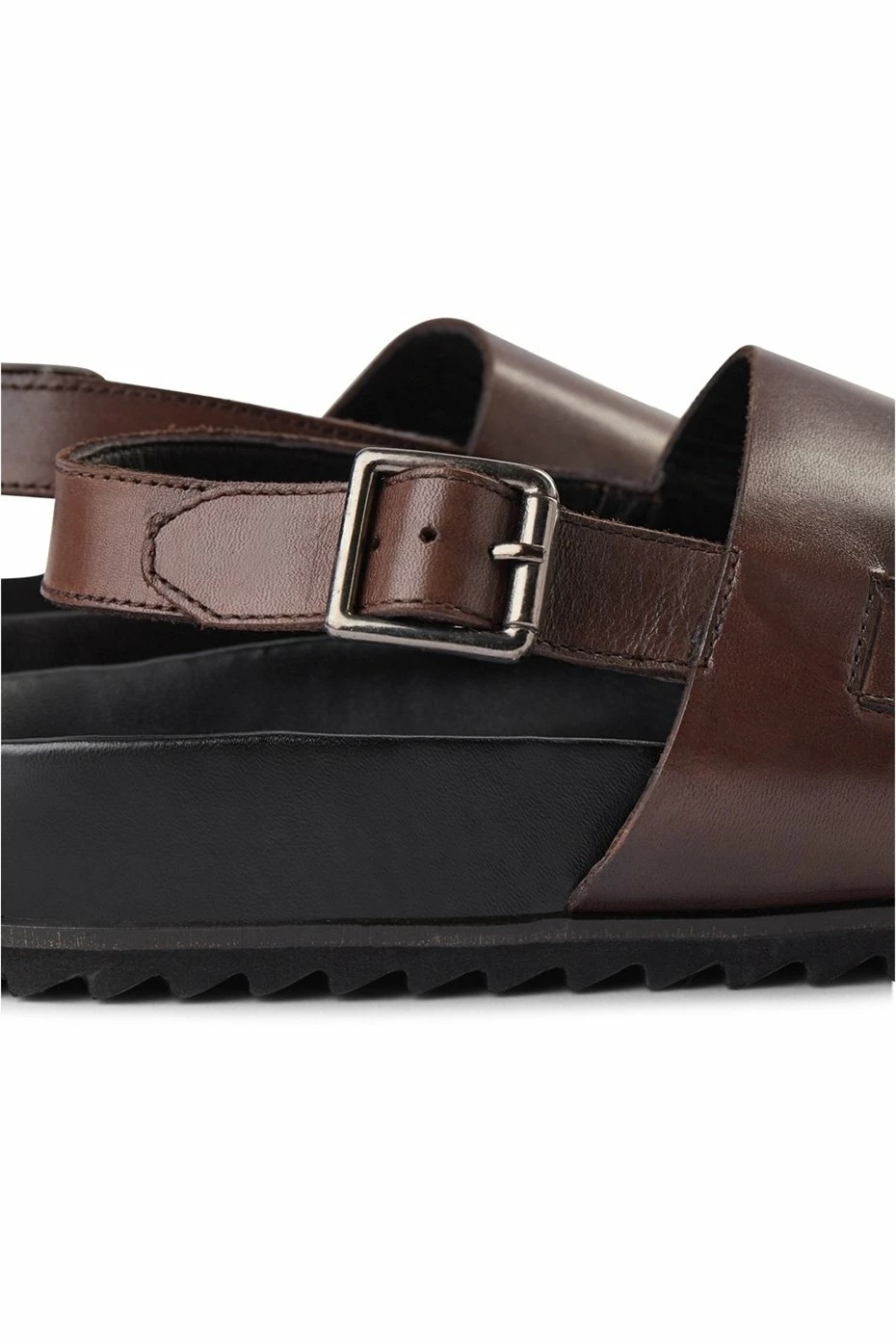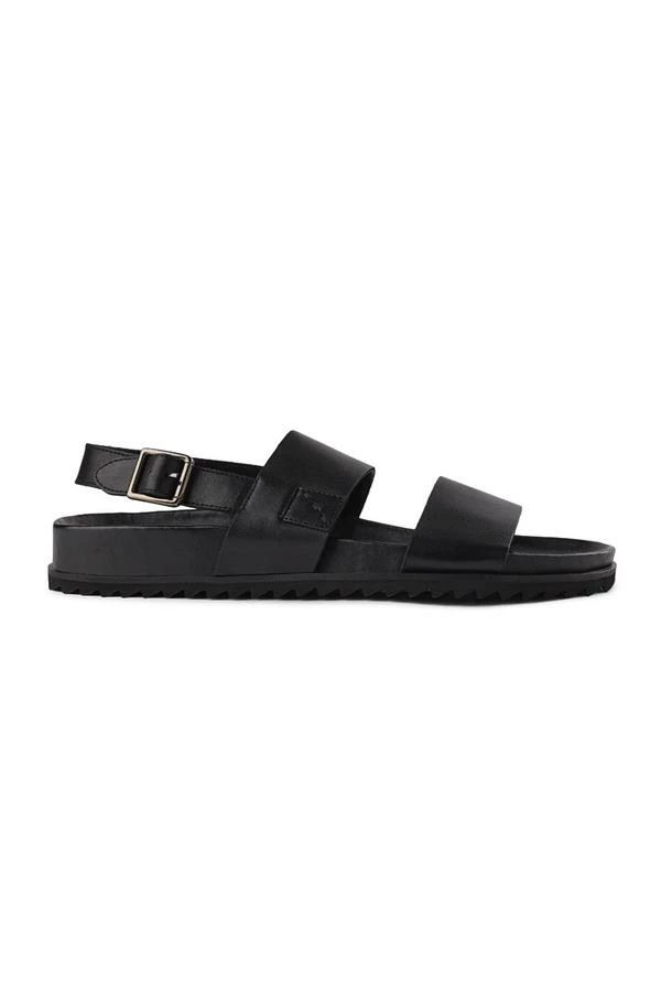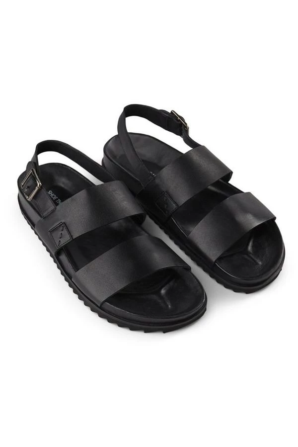 Classic sandal design with a single toe strap, ankle and heel strap with a metal buckle closure